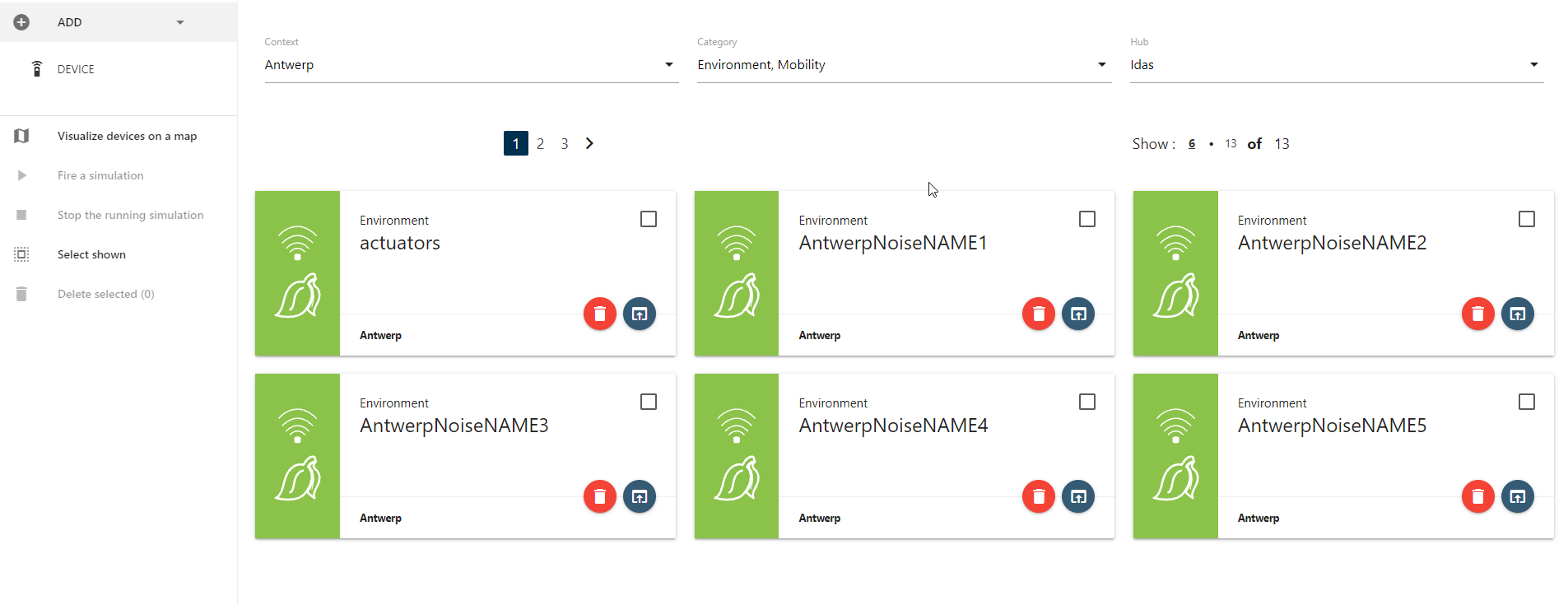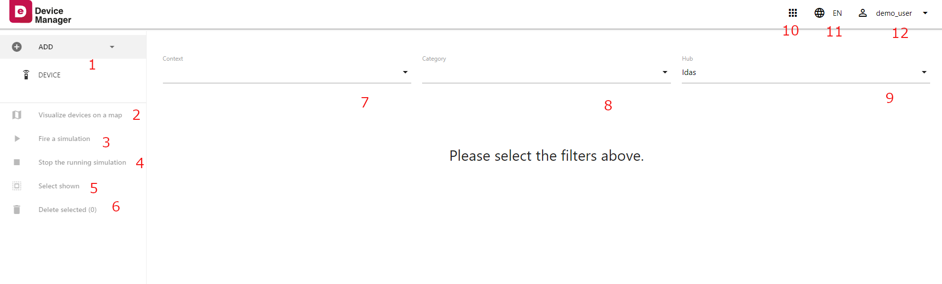 - 3 drop-down menus for filtering devices: Context (7), Category (8), Hub (9).