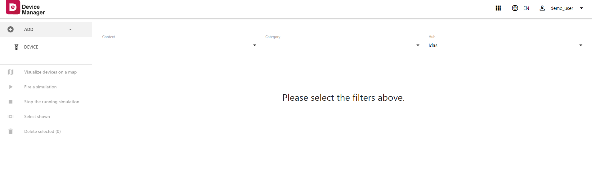 The URL to access this tool is https://devices.demo.digital-enabler.eng.it. The system asks for credentials. After successfully logged in, the user will be redirected to the DeMa's landing page.