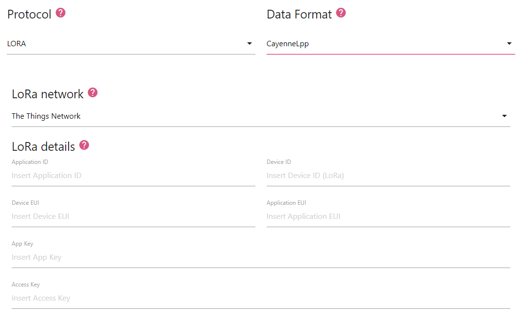 - Data Format: format of the data provided by the device (e.g. JSON, Ultralight 2.0- UL2.0, SIGFOX, LWM2M, OPCUA, CayenneLpp, CBOR, custom, etc )