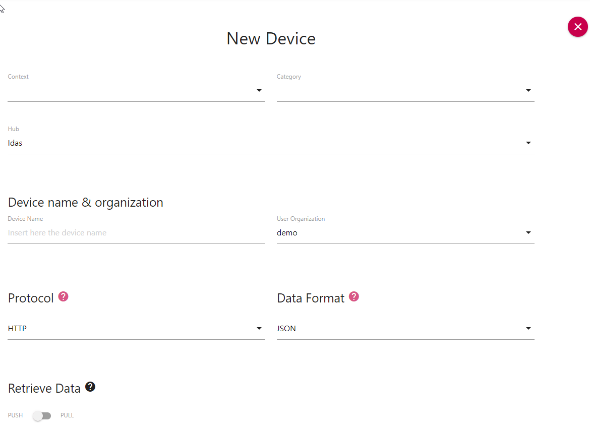 - Push mode of devices is used when device will push data (i.e. send sensor measurements) to the platform. It is set as a default mode when user opens a page for creating a new device, so user does not need to change anything in order to create a device in "Push" mode.