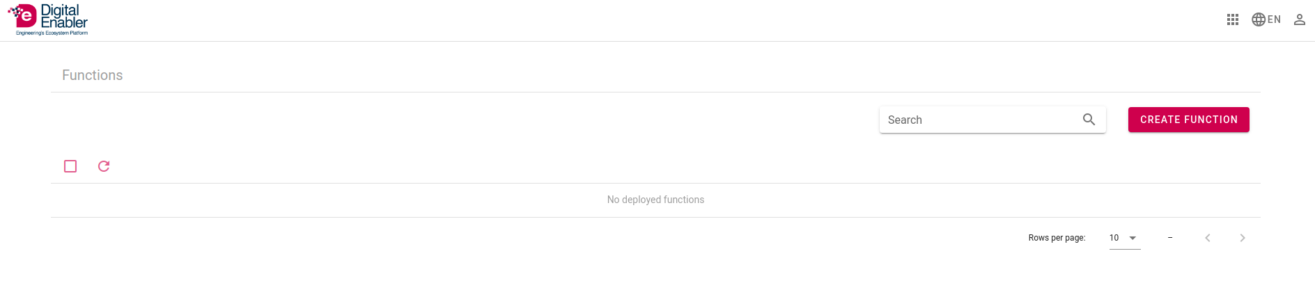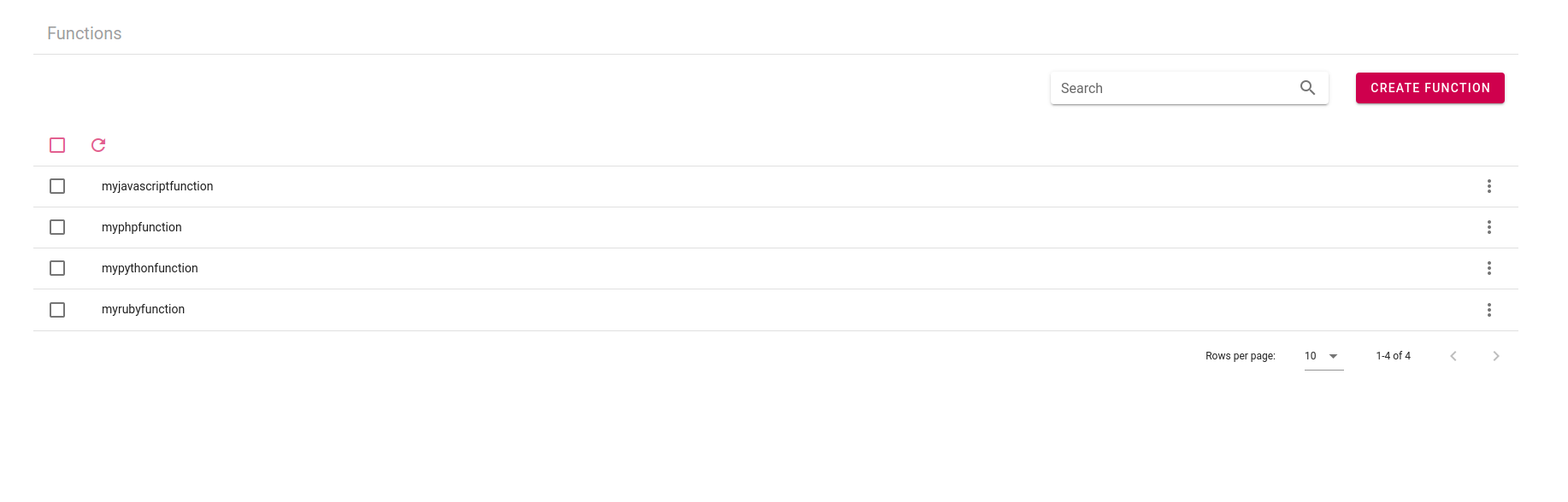 The page shows the currently deployed functions and allows you to create new ones through the top-right corner placed red button.