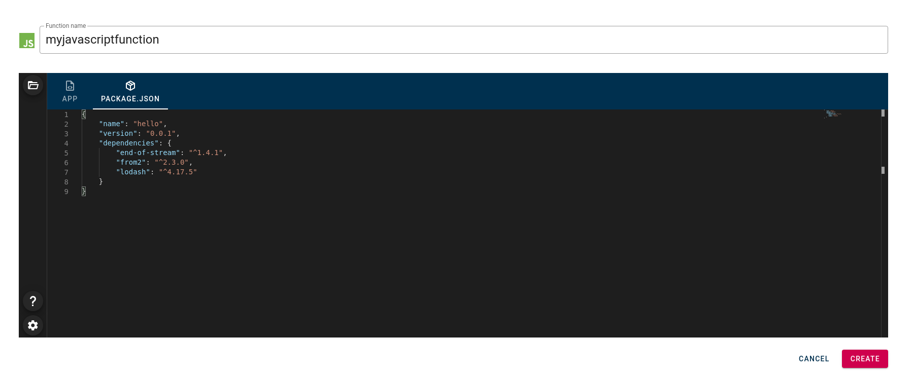 On page for creating function, you could find that are named in our case package.json. This is in correlation with the programing language that you choose. For example, if you choose Java this section will be named pom.xml instead of package.json and for PHP it will be name composer.json .