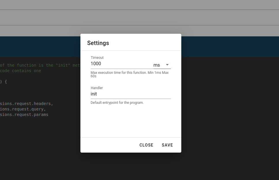 - Timeout - for setting execution timeout of the function. By default, is 1000 ms. If a function takes more than that in being executed, that process will be terminated.